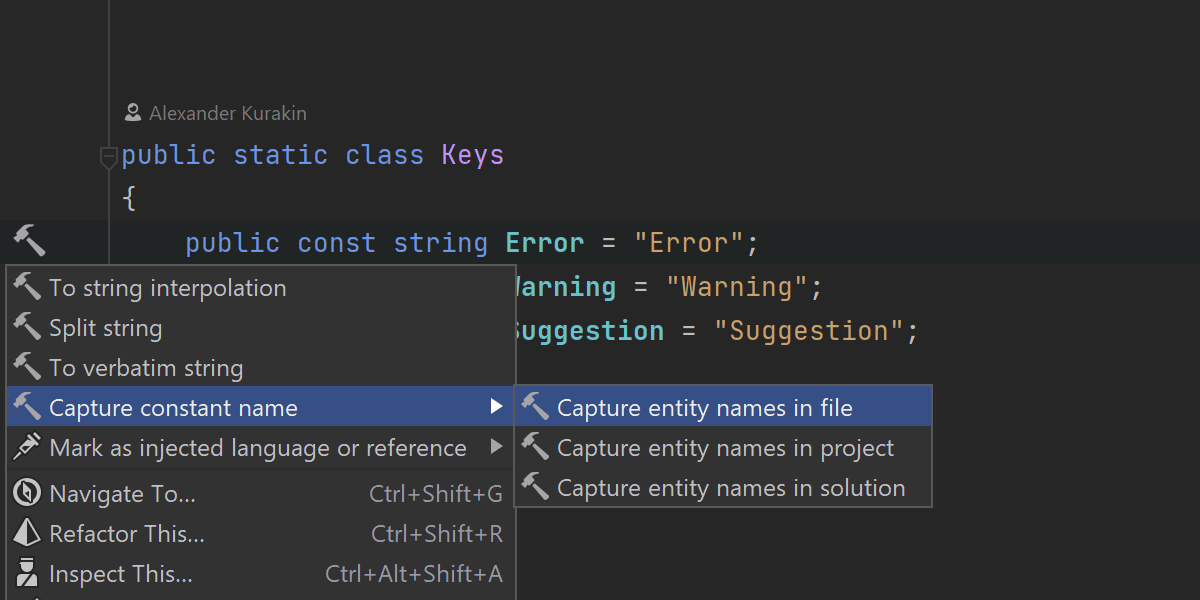 Rider 通常无法识别代码中指定某些代码实体名称(如成员或类型名称)的特定字符串字面量的特殊含义。 对此,我们为字符串字面量引入了新的 Capture element name(捕获元素名称)上下文操作,其标识符可以引用包含字符串字面量的上下文中的代码实体。
