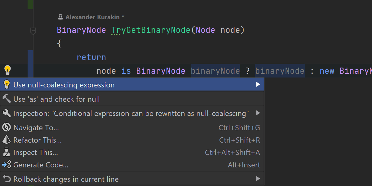 Rider 2022.2 现在能够将 ?: 表达式下的部分 is 模式替换为 ?? 表达式下更简洁的 as,有效消除了临时变量。