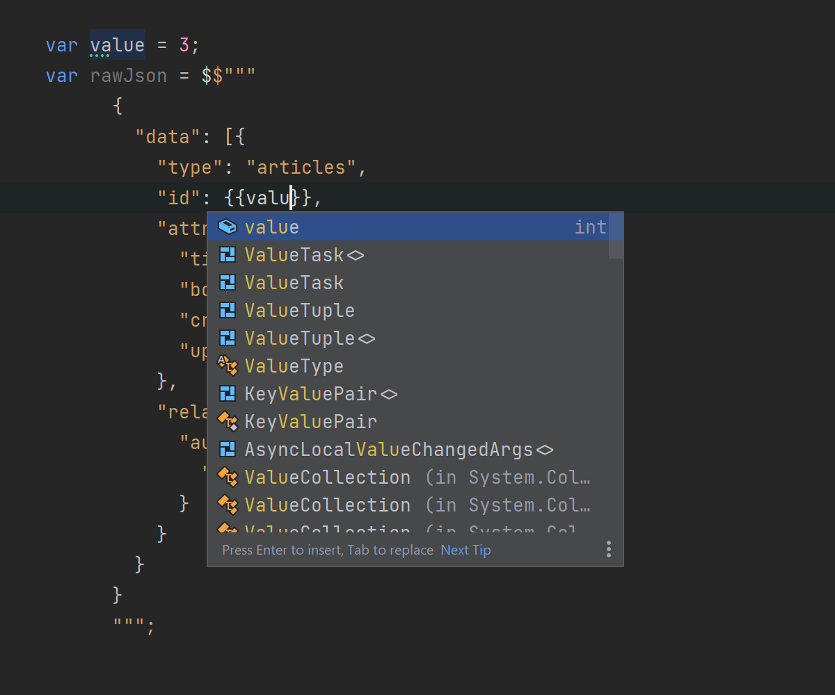 Rider 具有基本的原始字符串支持,包括编译器错误和正确解析以及 """ 语法的颜色高亮显示、双引号对和内插字符串内的占位符({{...}} 语法)。