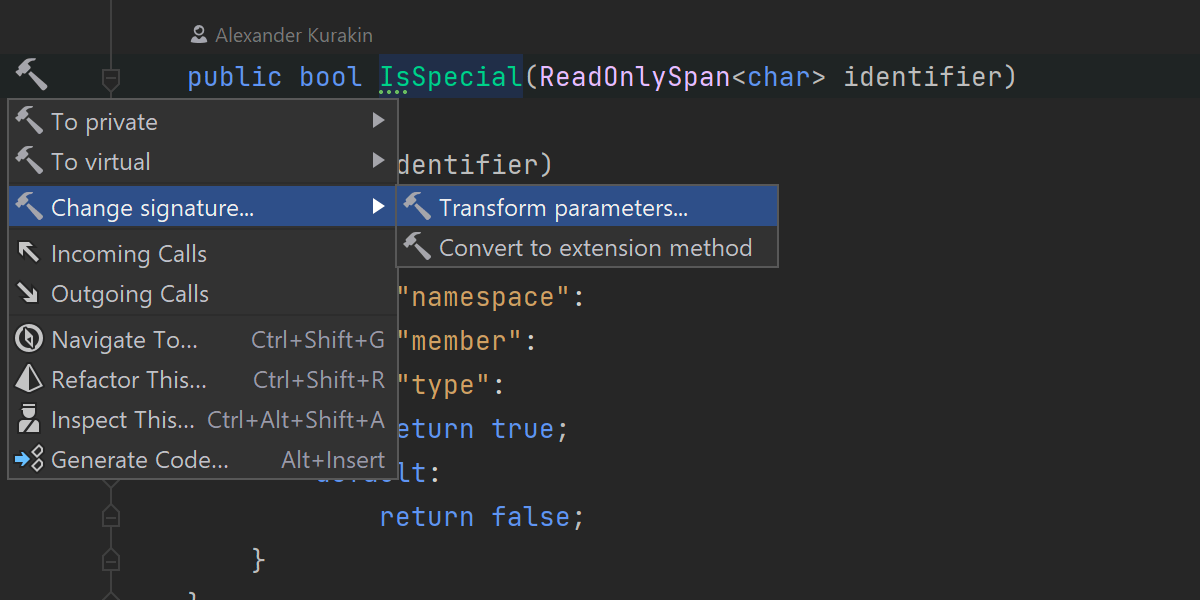 Change Signature(更改签名)、Transform Parameters(变换形参)、Convert to extension method(转换为扩展方法)和 Convert Property To Method(将属性转换为方法)重构现在都可用作成员签名的上下文操作。