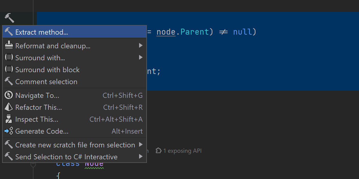 我们添加了在所选代码段上调用 Alt+Enter 菜单时的 Extract method(提取方法)上下文操作。