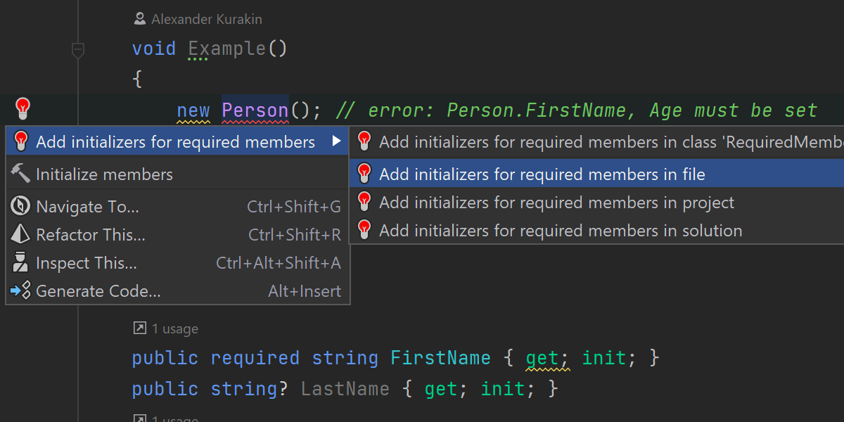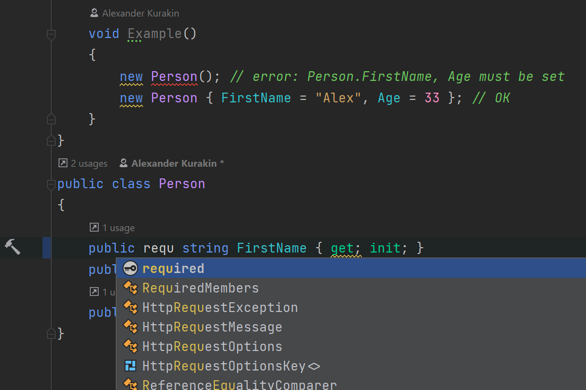 除了能够检测 class、struct 或 record 类型中成员的 required 关键字之外,Rider 还为 required 关键字提供了额外支持: