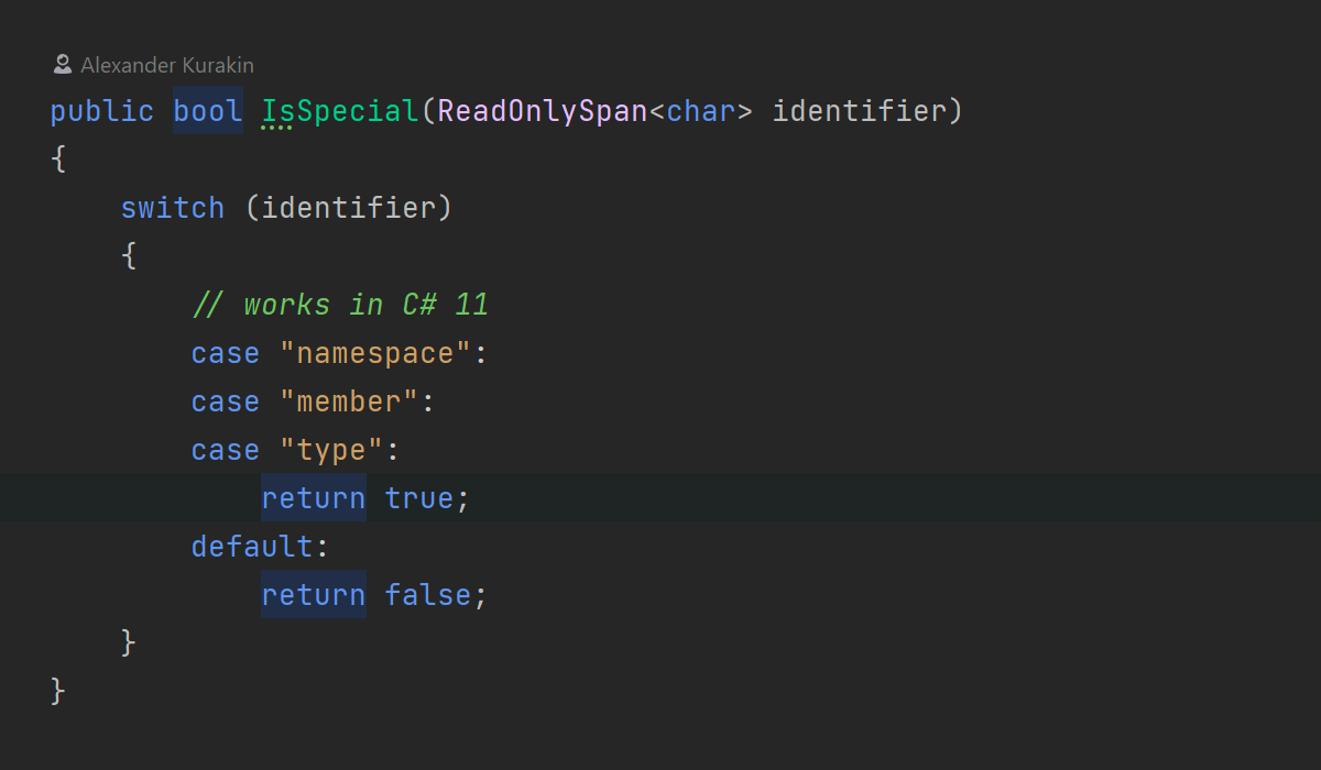 >>>),包括对用户定义运算符 >>> 重载的支持。 Span<char> 值的使用以替代字符串实例,因为在 C# 11 中,字符串常量可以直接与 Span<char> 和 ReadOnlySpan<char> 类型的值进行模式匹配。