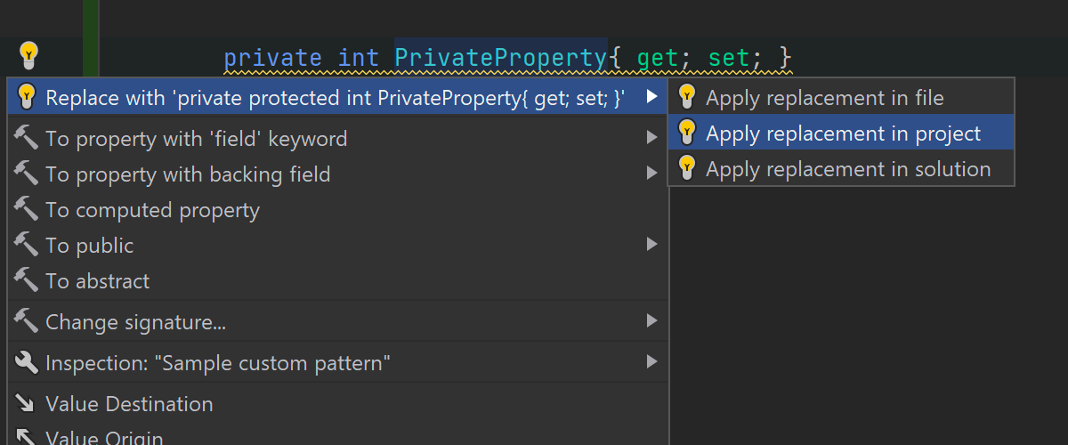 来自结构化搜索和替换 (SSR) 模式的快速修复现在可应用于文件、文件夹、项目或整个解决方案范围。 它会影响用户自定义模式、Rider 内置代码检查以及基于 SSR 的相应修正。