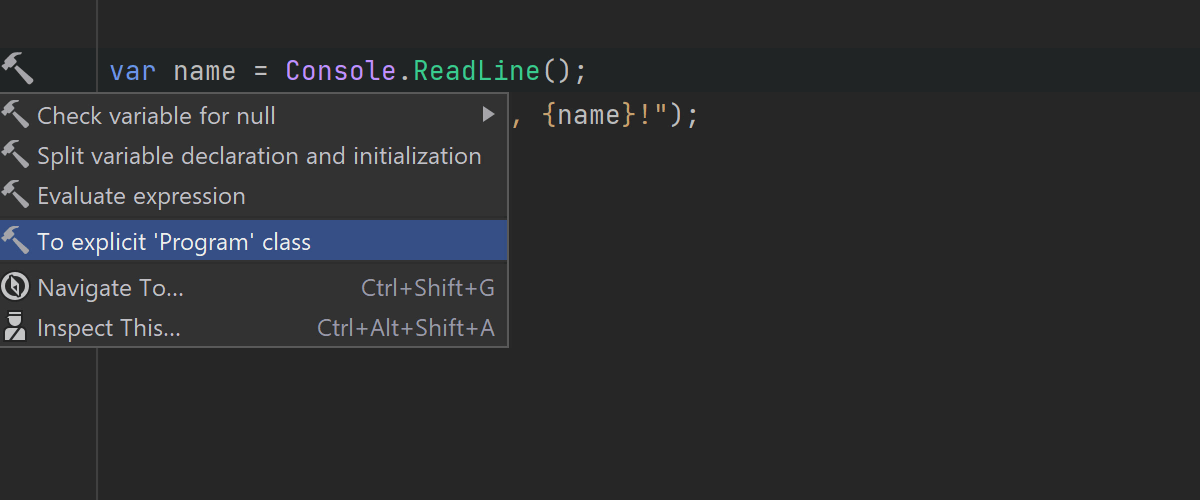 .NET 6 引入了使用 C# 9 顶级语句的新项目模板。 顶级语句简化了 Program 类或 public static void Main(string[] args) 方法的声明。 但有时,显式启动 class Program 是必要做法或更优解。 Rider 2022.2 添加了新的上下文操作 To explicit 'Program' class(到显式 'Program' 类),用于执行对旧样式的转换。