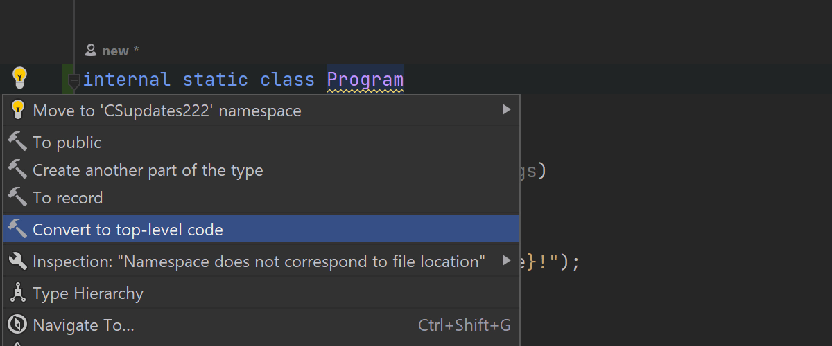 同时,如果您拥有现有 Program 启动类并希望迁移到顶级语句,可以使用新的 Convert to top-level code(转换为顶级代码)上下文操作。