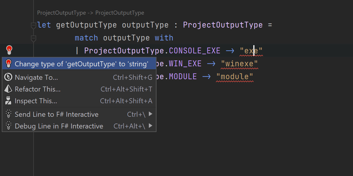 新的快速修复 Change type of binding(更改绑定类型)适用于定义的返回类型与表达式的实际类型不同的情况。 特别感谢 Florian Verdonck 实现 此快捷修复。