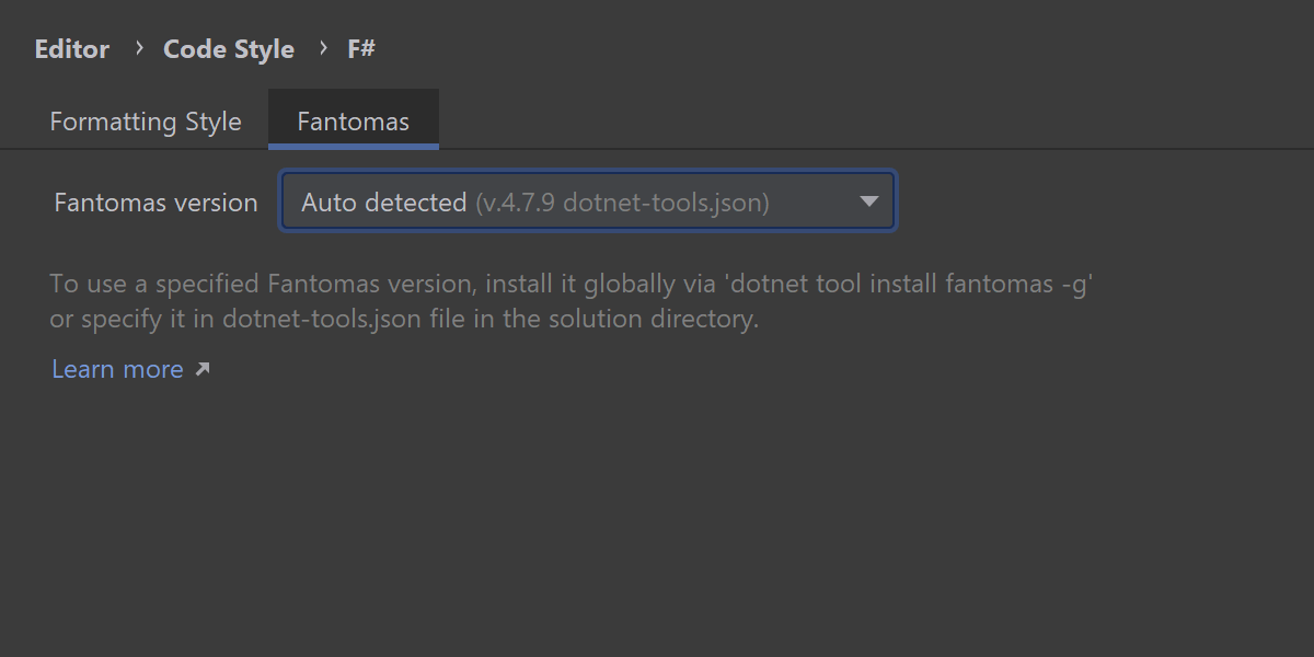 您现在可以使用 Fantomas 的全局或本地 dotnet 工具版本。 Rider 将自动使用对应工具,供您在团队中同步 Fantomas 版本。