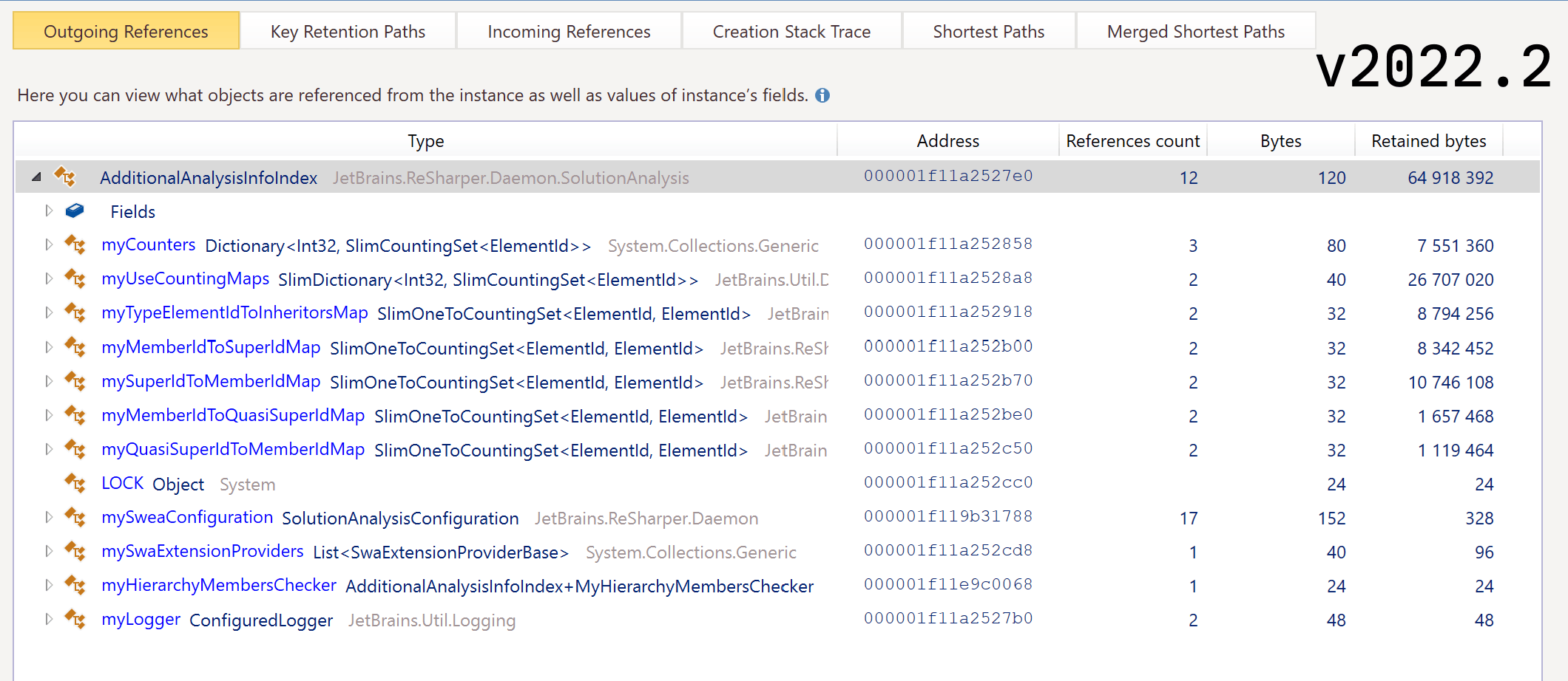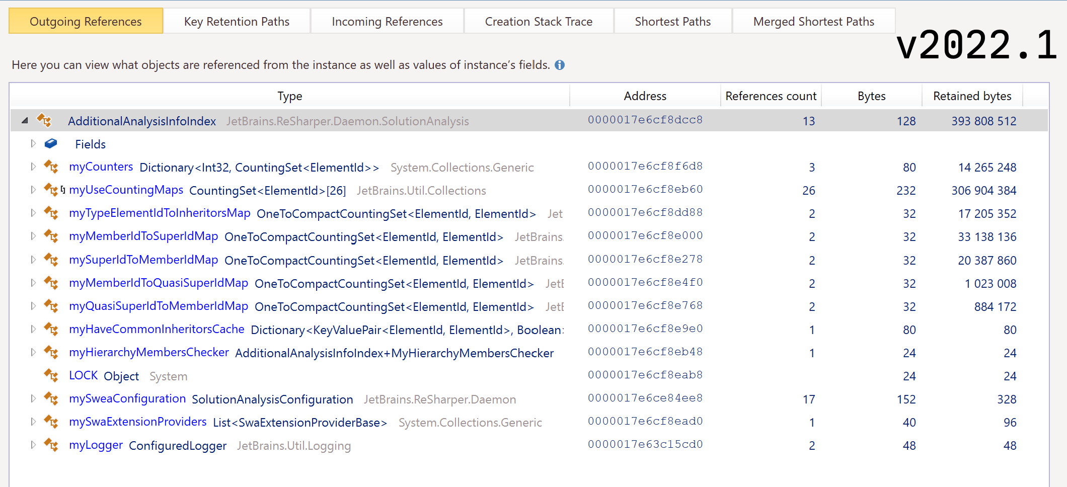 解决方案级分析引擎使用内存存储解决方案中的问题列表,并为执行解决方案级使用报告(代码检查,如“public 成员从未使用”)而存储类型/成员使用信息。 “热”使用数据表示它需要在编辑代码期间不断更新,并且不能卸载到磁盘上。 如果解决方案包含大量类型和类型成员,这可能会消耗大量内存。 经过对内存中所存储数据的研究,我们找出了允许删除重复数据/规范化数据的模式。 我们还通过专用集合类型进一步减小了工作集。 这些优化实现了 5-10 倍的内存消耗改进和更快的解决方案级分析加载。