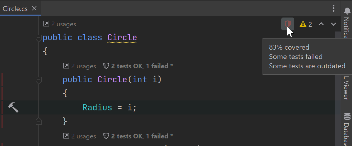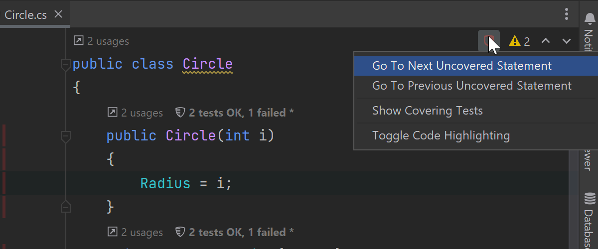 我们向编辑器添加了覆盖摘要指示器。 dotCover 插件产生的红色和绿色高亮显示可能会稍显突兀,新工具在这方面有所改善。 在 Inspections(检查)微件中查找盾形图标。 颜色和填充反映了当前文档的代码覆盖,点击即可浏览未被覆盖的语句。