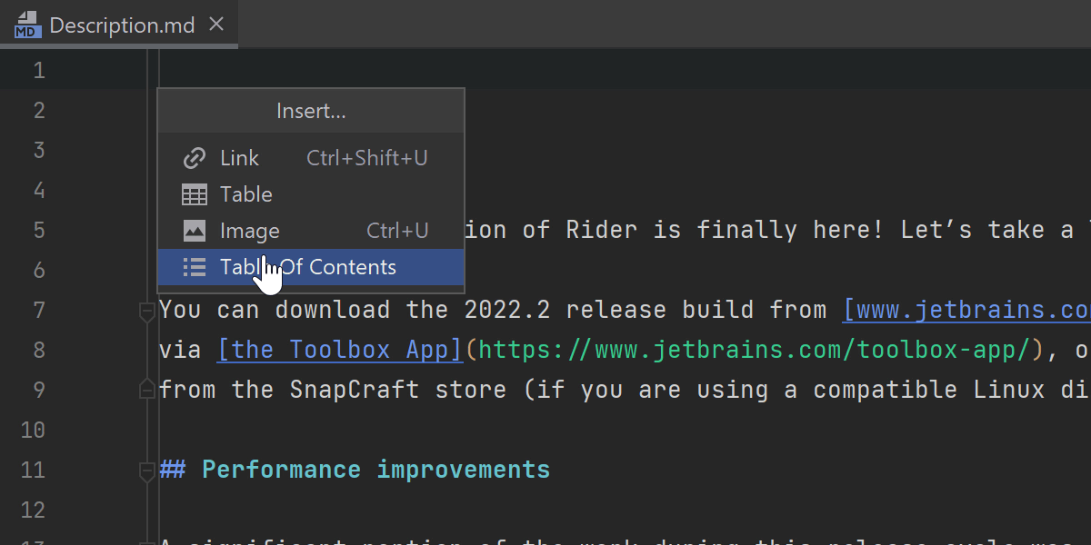 现在,在 Markdown 文件中可以根据文档标题轻松生成目录。 新操作位于 Insert(插入)和 Generate(生成)弹出菜单中,可以通过 Alt+Insert 快捷键或右键点击调用。 Rider 将在当前文本光标处插入目录并以 <!-- TOC --> 标记将其括起,后续调用相同的菜单可以对其进行更新。
