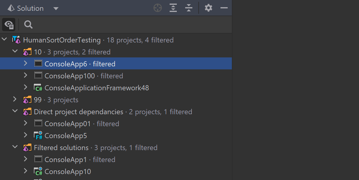 您可以在 Rider 2022.2 中更轻松地使用筛选过的解决方案。 您现在可以从得出的解决方案中筛选出一个项目、一组项目、一个解决方案文件夹或者所有项目。 为此,请在 Solution Explorer 视图中的项目、解决方案文件夹或根解决方案节点的上下文菜单中使用 Solution Filter | Remove project(解决方案筛选器 | 移除项目)操作。 要查看被筛除的项目,请在 Solution Explorer 视图中启用 Show All Files(显示所有文件)模式并使用上下文菜单中的 Solution Filter | Add Project(解决方案筛选器 | 添加项目)操作。