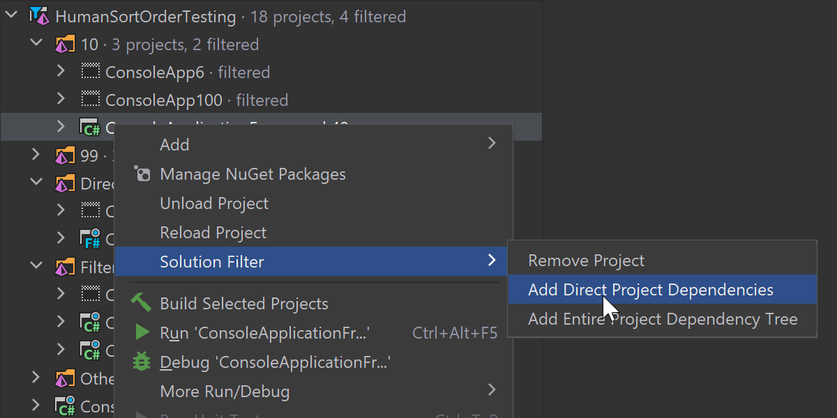 除了这些基本操作之外,Rider 还提供了两个更高级的操作:Load Direct Project Dependencies(加载直接项目依赖项)和 Load Entire Project Dependency Tree(加载整个项目依赖树)。 这些将让 Rider 检查目标项目的所有依赖项并加载必需项目集,您可以由此快速开始处理筛选的解决方案。