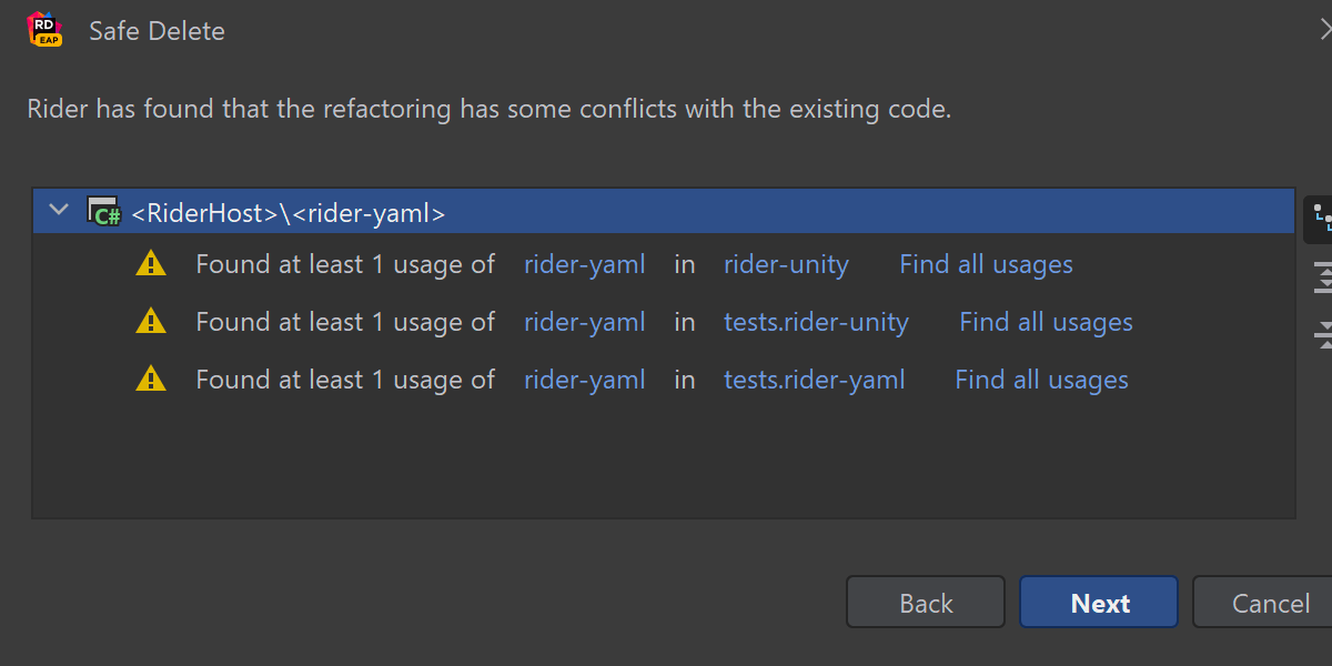 我们在项目级别实现了 Safe Delete(安全删除)重构。 您可以使用 Delete 键或在 Solution Explorer 中的项目上使用 Refactor This(重构此)操作来调用它。 Rider 将搜索所选项目的用法。 如果存在用法,将显示冲突,如果不存在,项目将被删除,并且 Rider 将移除剩余引用或导入。 有一个选项可供在无需这些检查的情况下移除项目,在显示 Safe Delete(安全删除)对话框时取消选中 Search for usages(搜索用法)选项后,Rider 就不会运行此搜索。