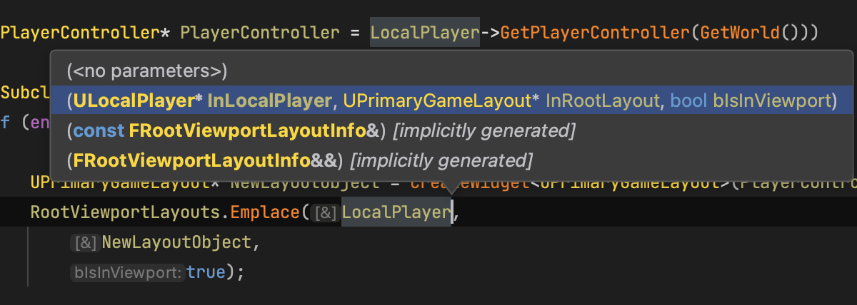 Rider 现在理解类 Emplace 函数调用(例如 TArray<..>::Emplace)意味着对象构造,因此它会就传递给构造函数的无效实参向您发出警告。 您可以在输入实参时看到形参名称提示和形参信息。 您也可以直接在 Emplace 调用和构造函数定义之间跳转。