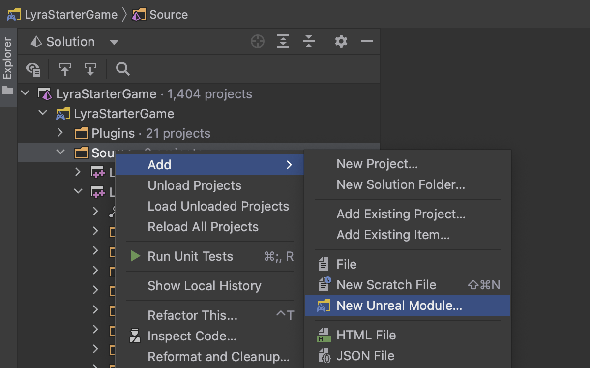 创建带有游戏逻辑的新模块会带来许多杂事:添加文件夹、将 Build.cs 文件添加到文件夹、创建初始化模块的类、更新 .uproject 和 Target.cs 文件等。 Rider 现在添加了一个可以帮助您自动执行这些任务的操作:Add | New Unreal Module(添加 | 新增 Unreal 模块)。