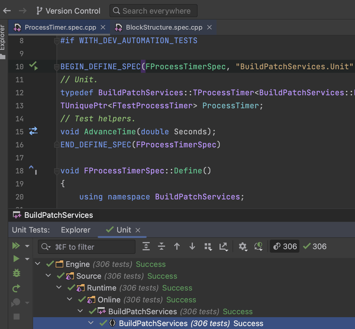 Rider 现已支持来自 Unreal Engine 自动化测试框架的规范测试。 在 DEFINE_SPEC 宏或 BEGIN_DEFINE_SPEC 和 END_DEFINE_SPEC 宏之后的 Define 方法中定义一组测试后,Rider 能够成功发现它们,供您在单元测试视图中运行和观察。
