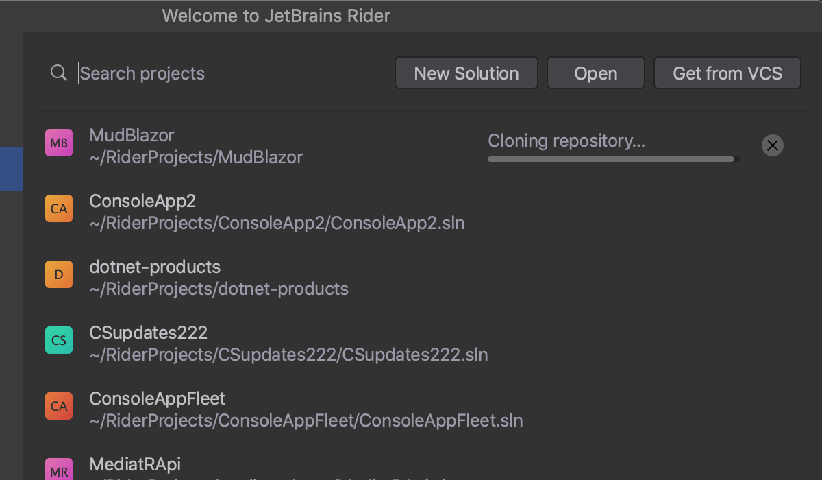 我们更新了 Rider 欢迎屏幕上 Cloning repository(正在克隆仓库)进度条的显示。 它现在直接显示在 Projects(项目)列表中,更清晰、更易用。