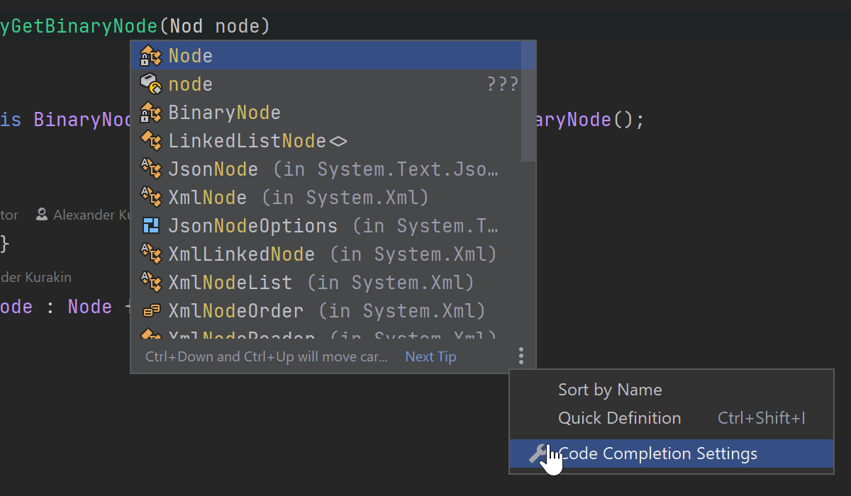 现在,您可以直接从代码补全弹出窗口中的垂直省略号菜单按钮访问 Code Completion Settings(代码补全设置)并配置偏好设置。