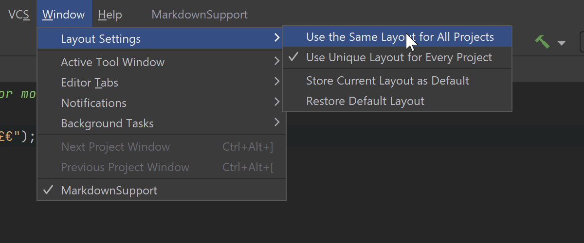 如果您刚接触 Rider,那么此行为将是默认行为。 如未启用,您可以选择 Windows | Layout Settings | Use the Same Layout for All Projects(窗口 | 布局设置 | 对所有项目使用相同的布局),在主菜单将其启用。