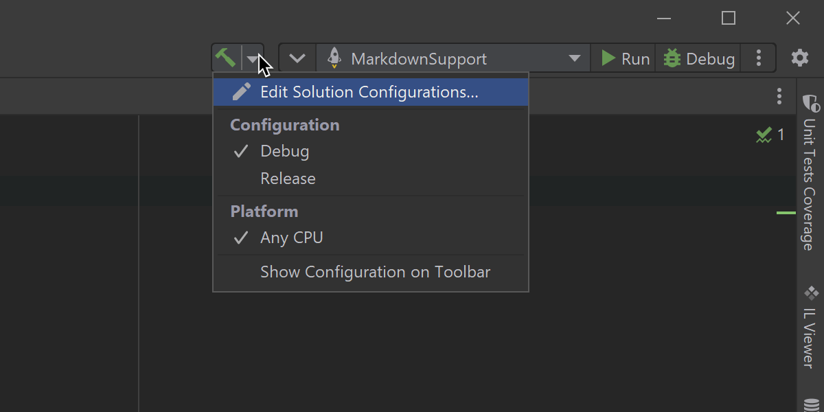 为了减少主工具栏上的混乱,我们已将解决方案配置列表移至构建图标的下拉菜单(绿色锤子)。 反馈和统计数据表明,用户不会经常更改解决方案配置,因此在工具栏上特别保留一个微件似乎有些多余。 不过,如果您需要配置,可以使用绿色锤子图标旁边的下拉三角。 这将打开相同的列表。