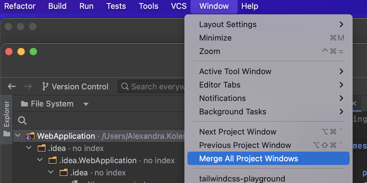 我们为 macOS 用户引入了一项功能,利用此功能可以将所有打开的项目窗口合并成一个,将其变成标签页。 转到 Window | Merge All Project Windows(窗口 | 合并所有项目窗口)即可执行此操作。