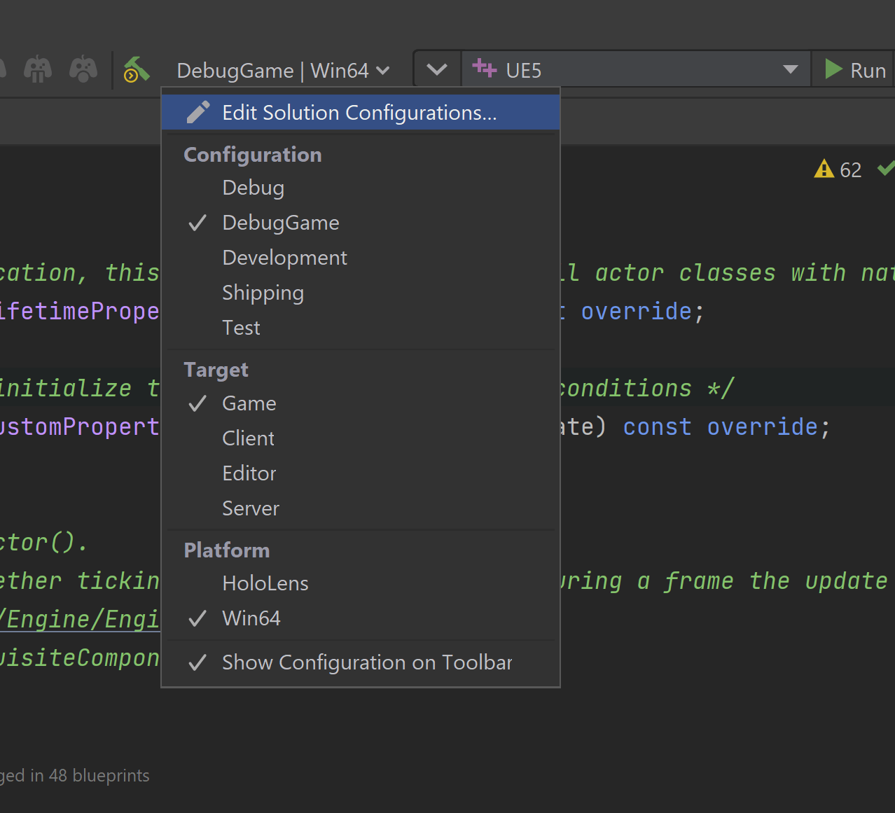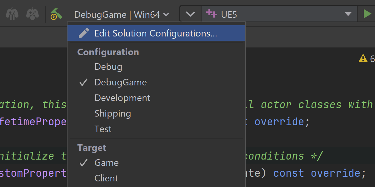 在此版本中,我们重新设计了解决方案配置的显示方式。 Unity、Unreal Engine 或 Xamarin 等项目通常具有许多配置、目标和平台。 此前,这些实体的组合会在 Solution Configurations(解决方案配置)菜单中产生大量条目。 从 2022.2 版本开始,您不再需要浏览一长串条目来选择配置、目标和平台的确切组合。 只需逐一点击形参类型,直到选择所需组合。