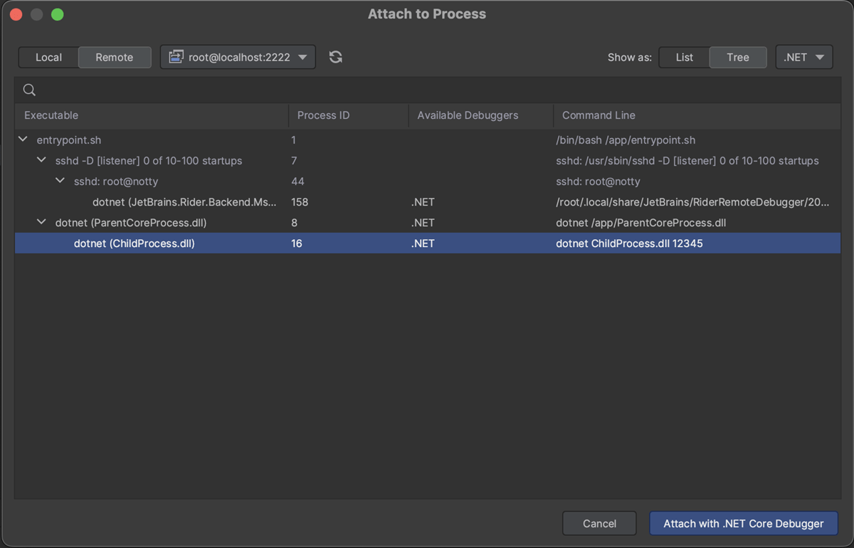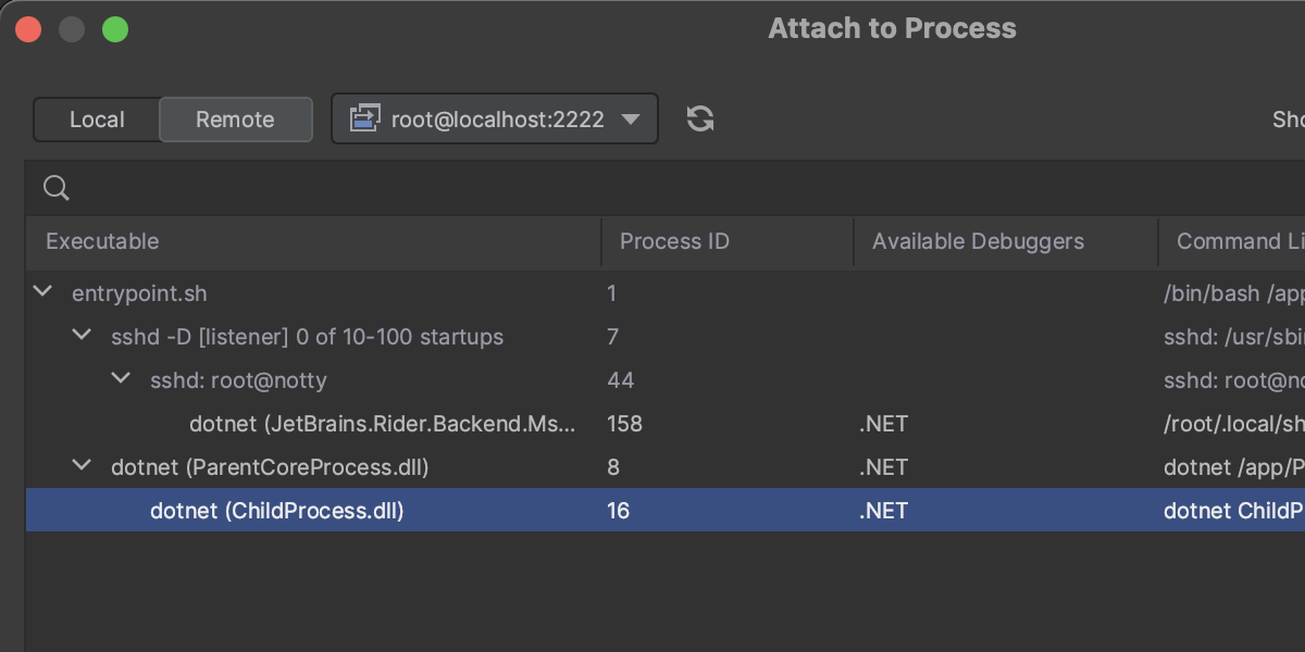 我们引入了新的 Attach to process(附加到进程)对话框以改进用户体验,尤其是通过 SSH 附加到进程的情况。 我们的目标是帮助您更快找到和选择正确进程,并让 IDE 记住选择的调试器。