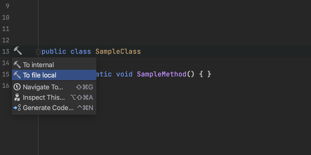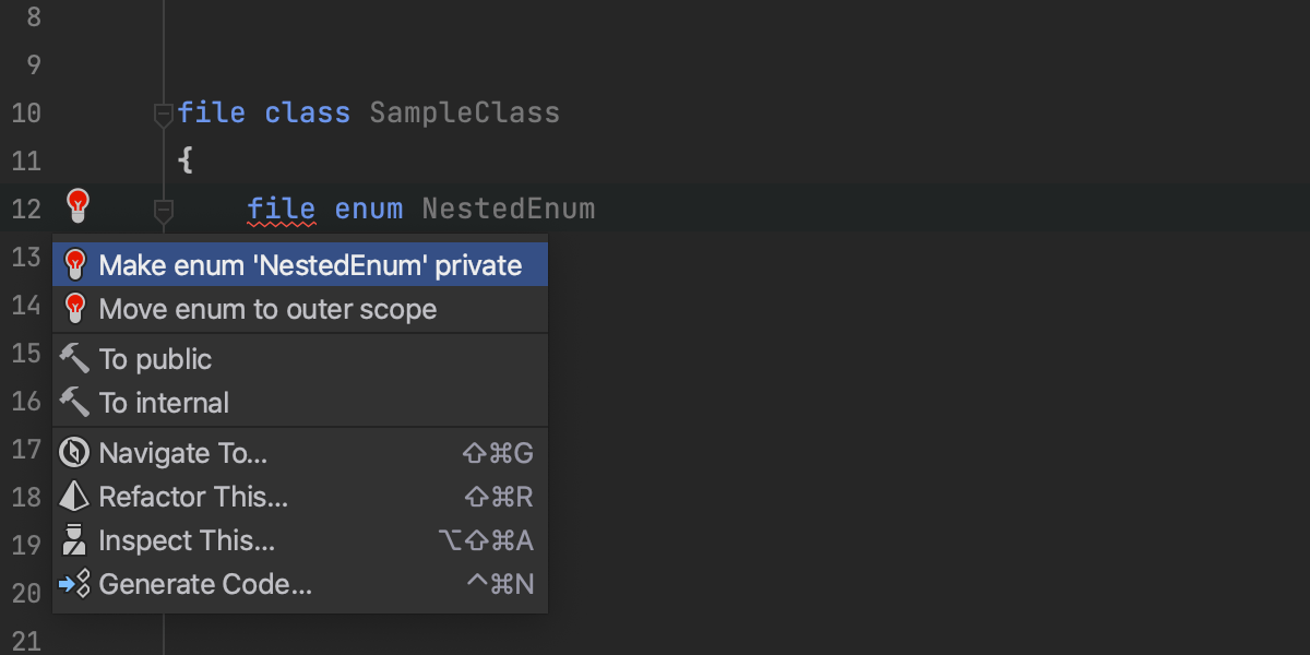对 file 局部类型的基础支持包括对新语法的理解、类型的 file 可访问性修饰符、编译器警告和错误以及相应快速修复,例如为嵌套类指定 file 修饰符时的 Move class to outer scope(将类移动到外部范围)。 还新增了一项实用的上下文操作,可以将通用类型转换为 file 类型。