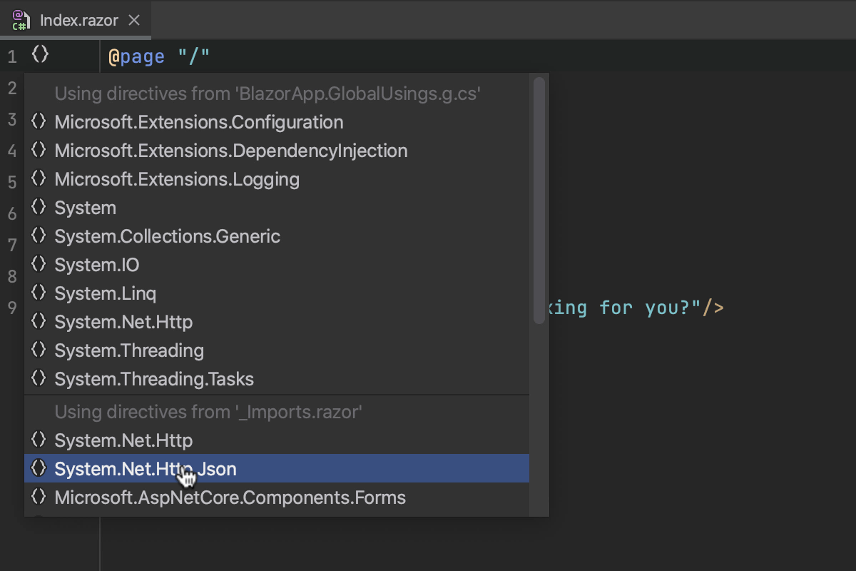 Rider 还提供来自 _Imports.razor 的全局导入,并允许导航到相应的导入定义。
