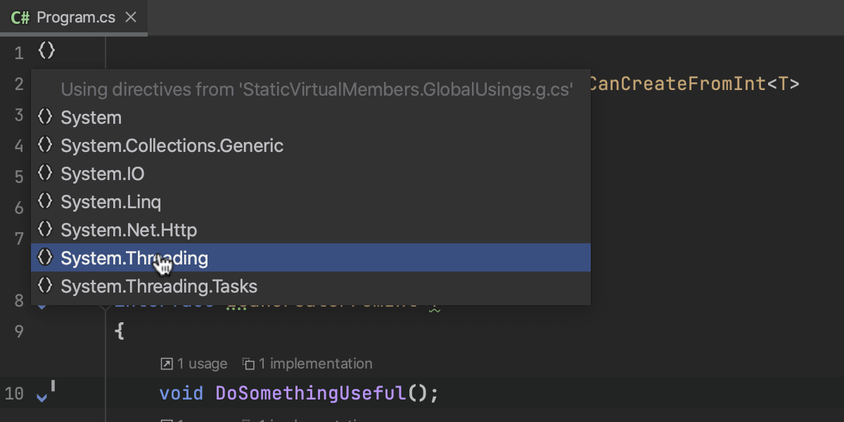 override 关键字后的代码补全建议还包括接口成员,因此现在您可以轻松实现 abstract 或 virtual static 成员。