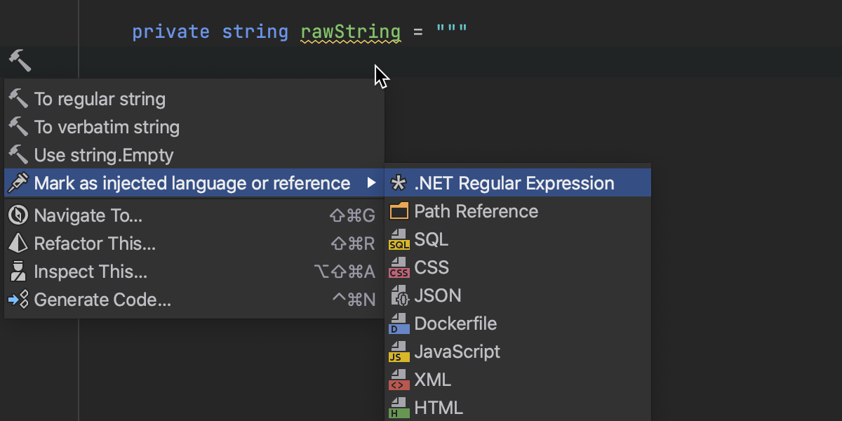 我们添加了对使用 [StringSyntax](来自 .NET 7)和 [LanguageInjection](来自 JetBrains.Annotations)特性的语言注入的支持,以及对 // lang=<language_name> 语言注入指令注释的支持。
