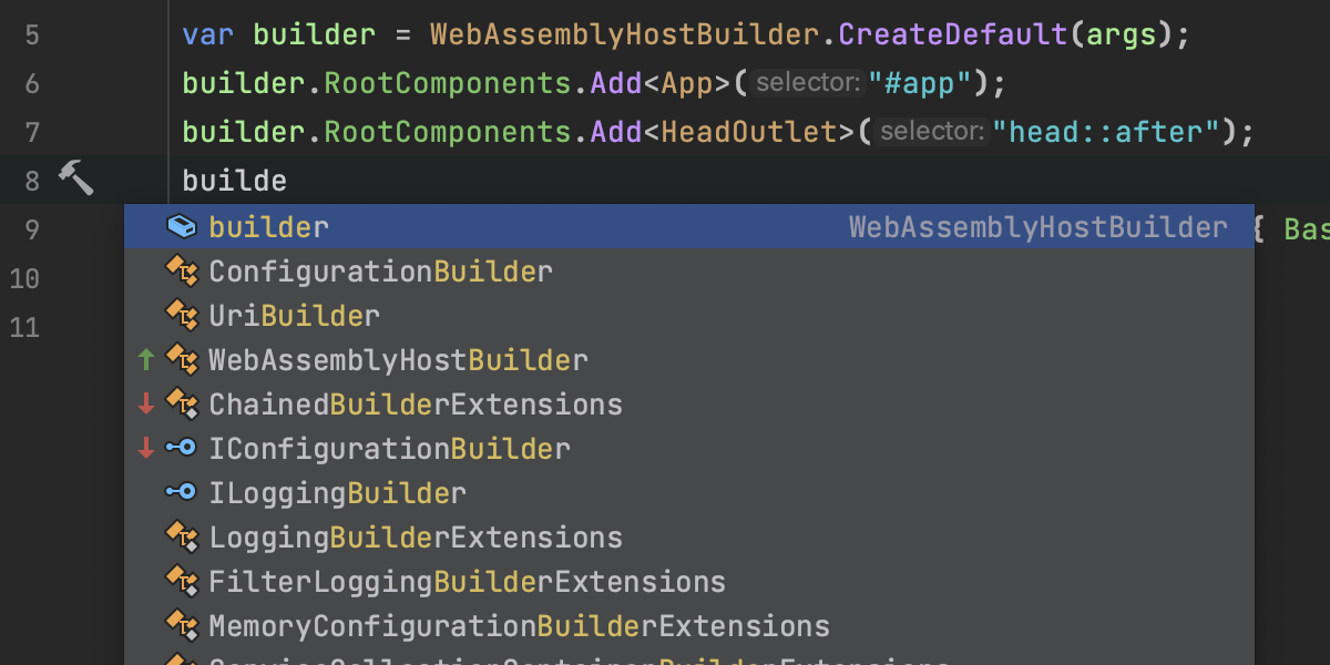 为了帮助您简化和加快开发过程,我们在 C# 中引入了用于代码补全选项的机器学习辅助元素排序。