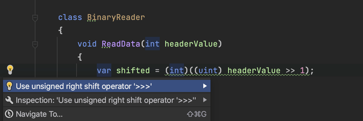 >>>) 运算符 Rider 现在可以识别 C# 开发者为了对有符号数据类型执行无符号右移而必须编写的繁琐代码模式,并建议改用 C# 11 中的无符号右移 (>>>) 运算符。