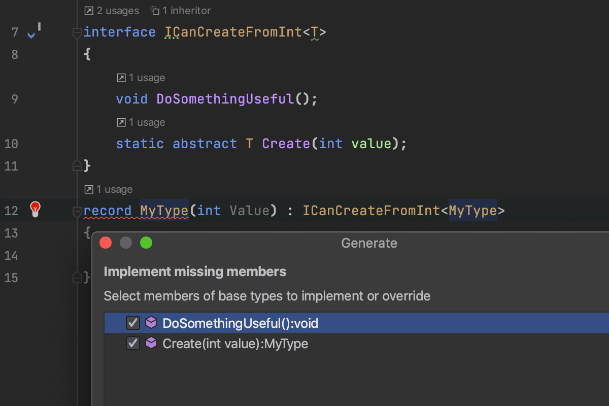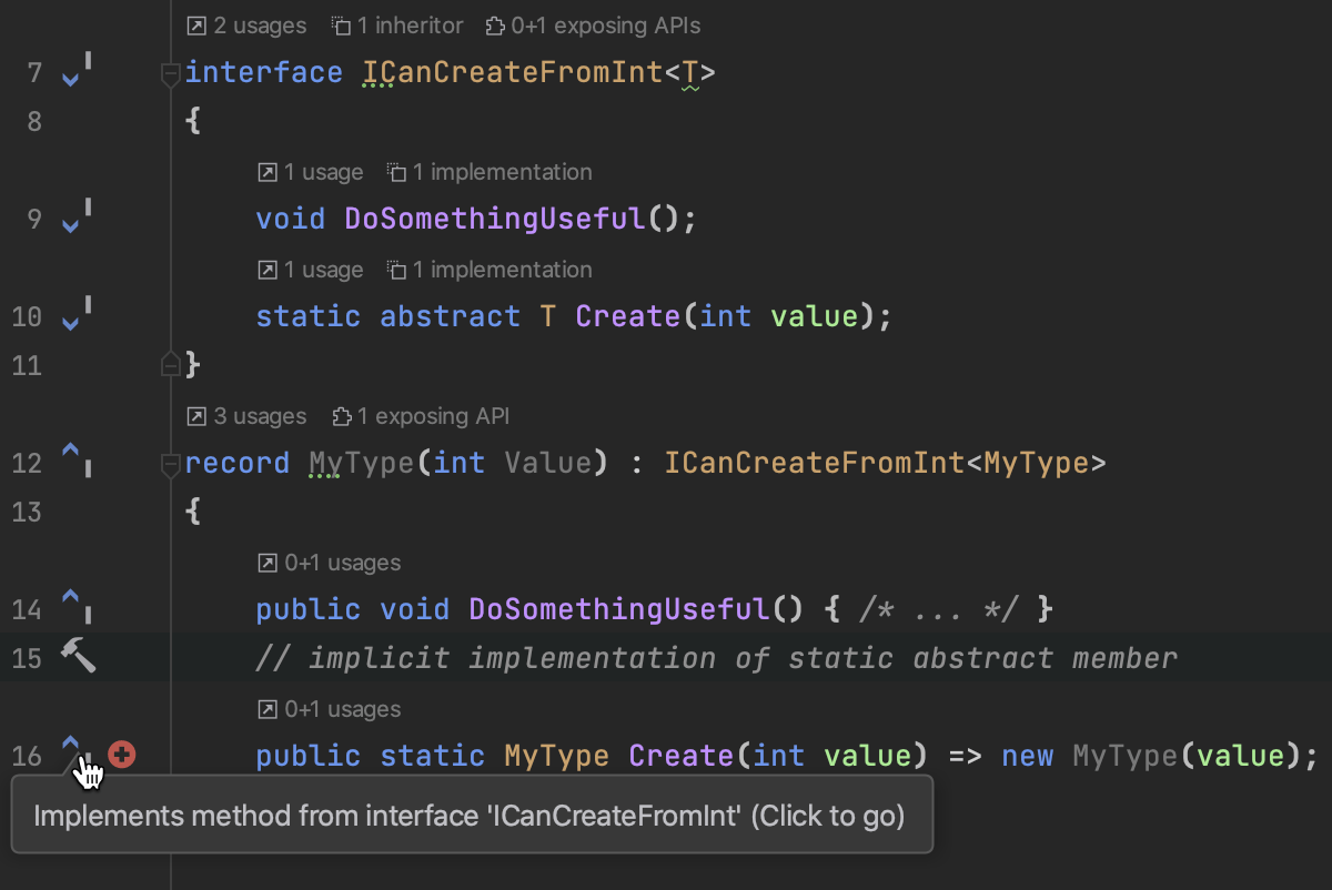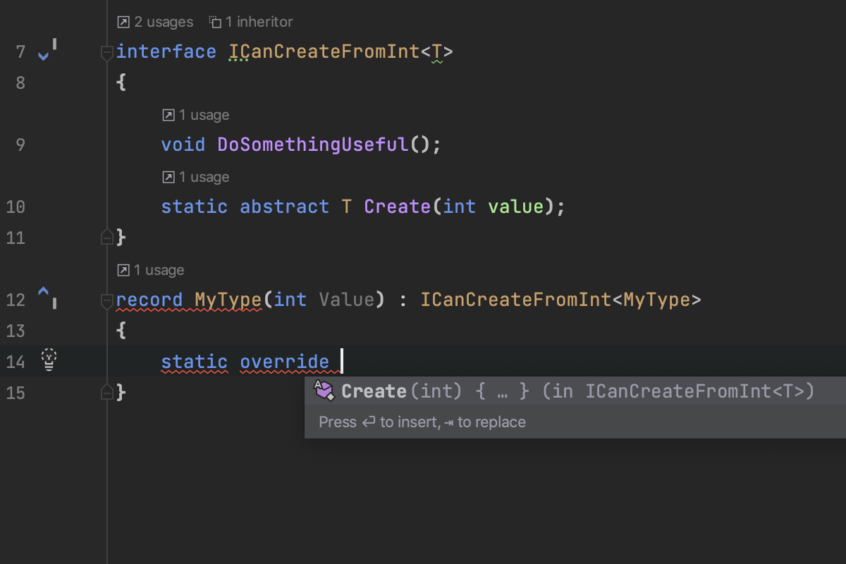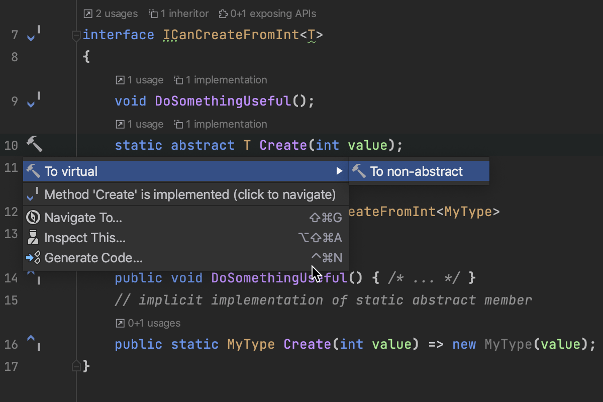 从 C# 11 开始,您可以对接口中的 static 成员使用 abstract 和 virtual 修饰符,并在类型形参受此接口约束的泛型代码中使用此类成员。 更新的 Rider 可以像处理普通多态成员一样处理多态 static 成员: