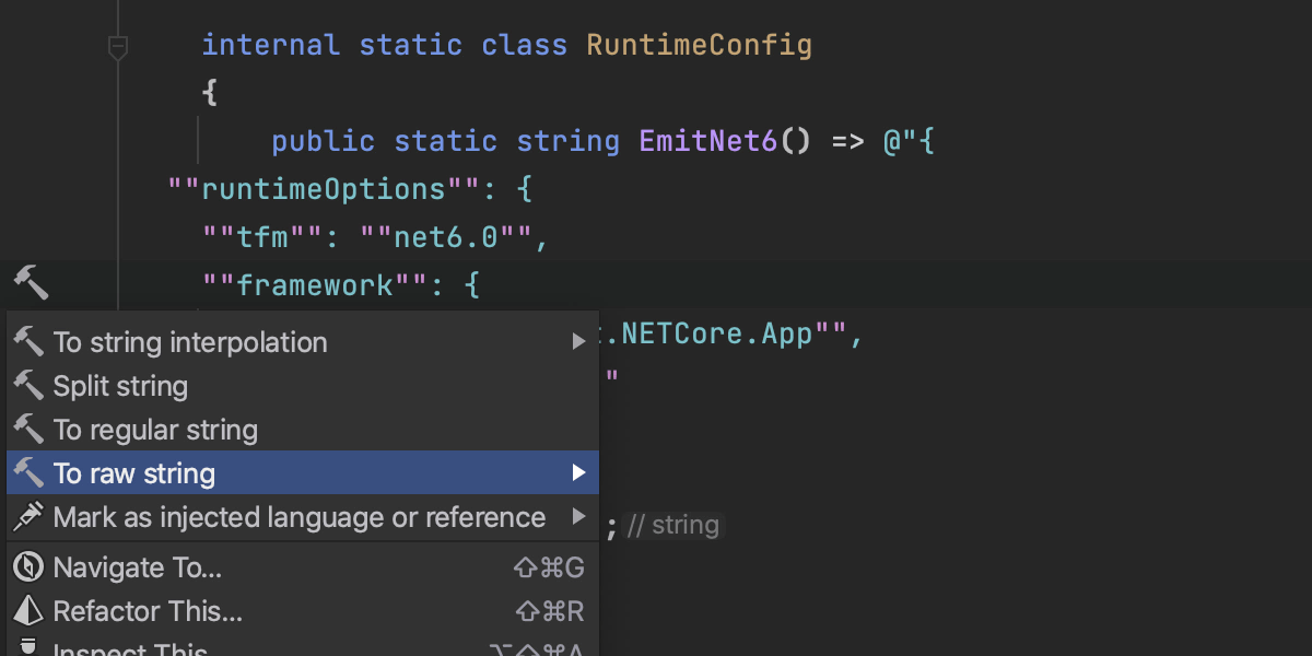 Rider 现在可以将常规字符串和逐字字符串转换为原始字符串。 这也意味着许多现有字符串功能可用于原始字符串。