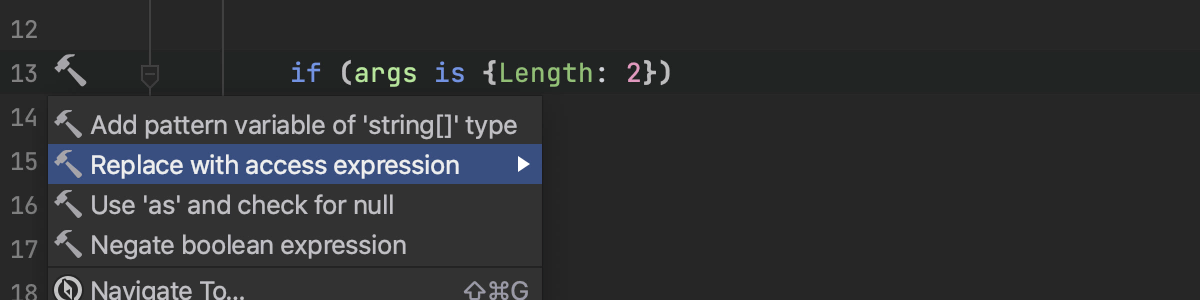 有时在重构之后,模式匹配表达式可能会变成普通的递归模式。 此时可能不值得使用递归模式语法,因此 Rider 现在提供将模式重写为更简单表达式的操作,同时保留原始模式匹配语义。