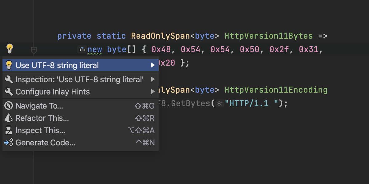 我们添加了对 UTF-8 字面量的基础支持。 代码分析现在会建议对字面量使用 u8 后缀,而不是 System.Text.Encoding.UTF8.GetBytes() 方法或具有适当 UTF8 符号的字节数组。 还有一组针对 UTF-8 字面量的编译器警告和错误。