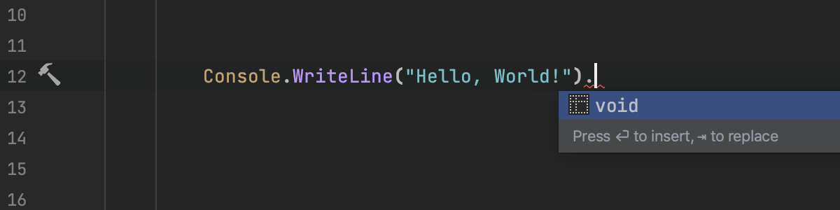 在调用后输入时,偶尔可能没有任何有意义的建议。 如果调用返回 void 的方法时调用没有产生任何值,就会发生这种情况。 这通常需要一些 IDE 操作后才能意识到(返回并导航到方法声明,或将鼠标悬停在调用上)。 在此版本中,我们针对此类返回 void 的调用引入了 void 提示条目,为您提供有关调用产生的类型的即时反馈。 如果缺少分号,接受此 void 条目将在调用后添加一个分号。