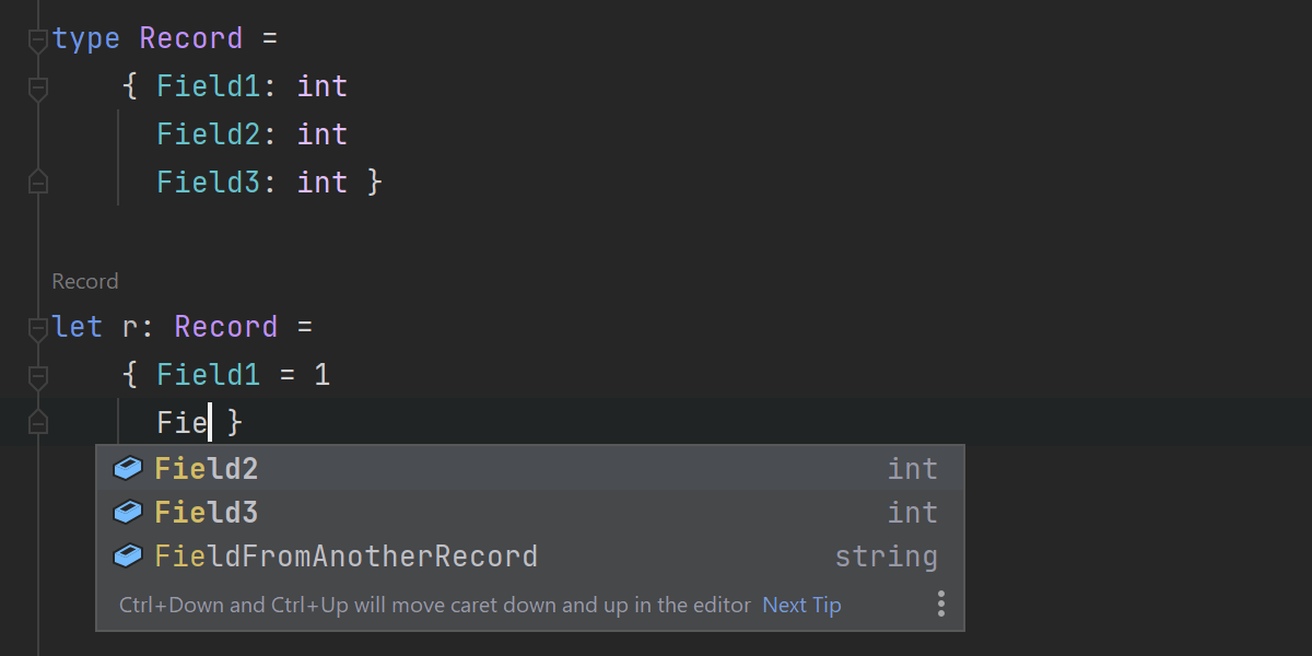 新的代码补全规则简化了 record 表达式的输入,它会强调推断的 record 类型中的字段,隐藏已使用的字段,并修正之前不显示建议的各种情况。
