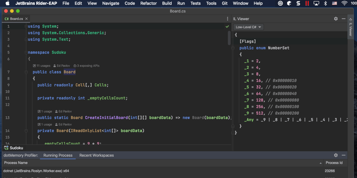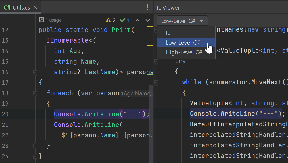 Rider 的 IL Viewer 工具窗口现在能够将代码反编译为不同级别的 C# 语言构造。 有两个可用的 C# 级别:高级 – 使用最新语言功能简化了某些语法构造,低级 – 用于您想知道这些语法构造如何脱糖的情况。