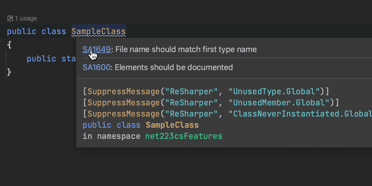 Rider 2022.3 中的代码高亮显示和波浪线得到了大修。 由于内部逻辑差异,Rider 曾经与 Microsoft Roslyn 的代码样式分析器发生冲突,导致其显示重叠高亮显示,在不同的位置绘制相同的高亮显示,或者双重波浪线。 大多数此类情况背后的逻辑差异现已得到解决,对于极少数异常,会提示错误并就如何解决冲突提出明确建议。