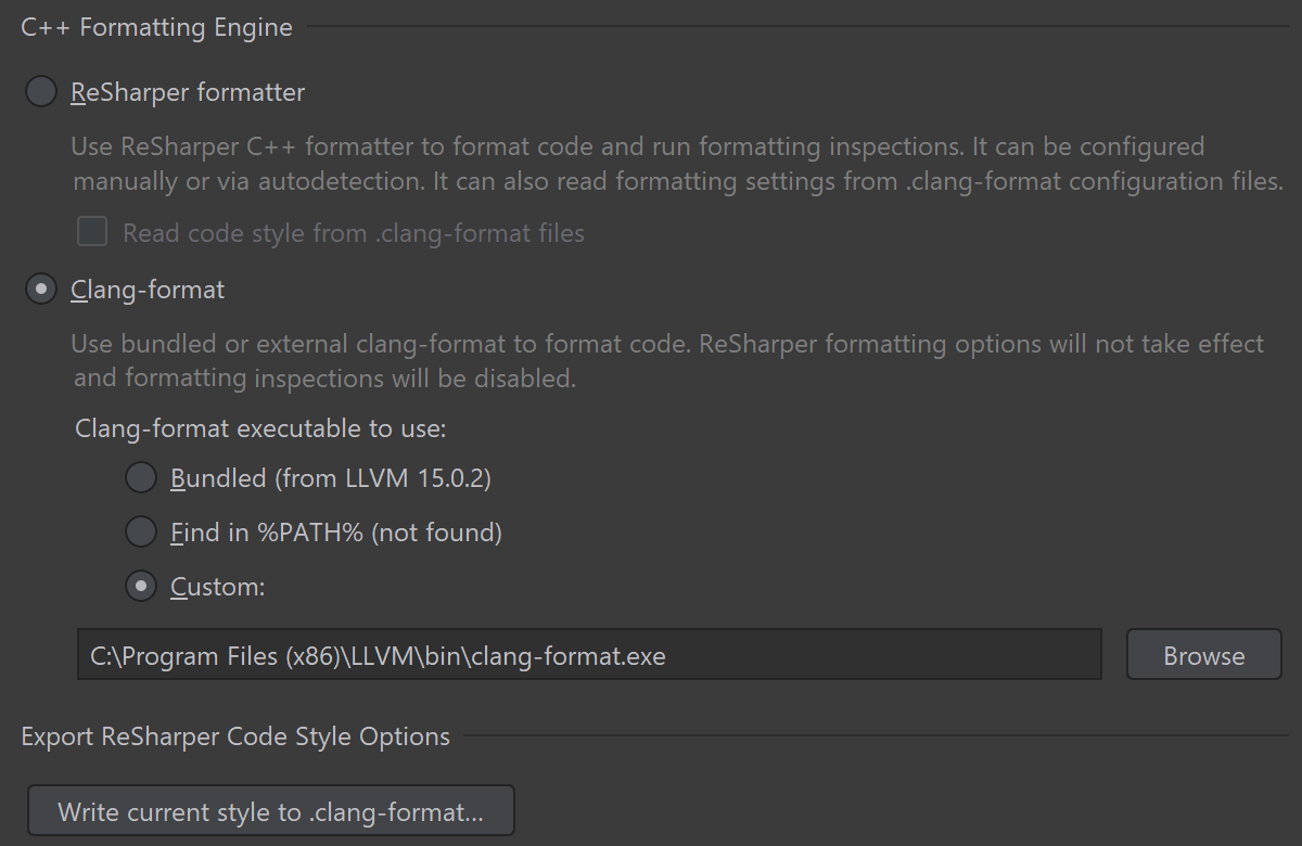 我们实现了直接运行 clang-format 二进制文件的选项,不再使用 Rider 的格式化程序引擎,确保与行业标准格式化程序完全兼容,提供更好的性能和更广泛的格式设置选项。 转到 Settings | Editor | Code Style | C++(设置 | 编辑器 | 代码样式 | C++)并选择 Clang-format 选项,您可以在捆绑的 clang-format 和外部 clang-format 选项之间切换。