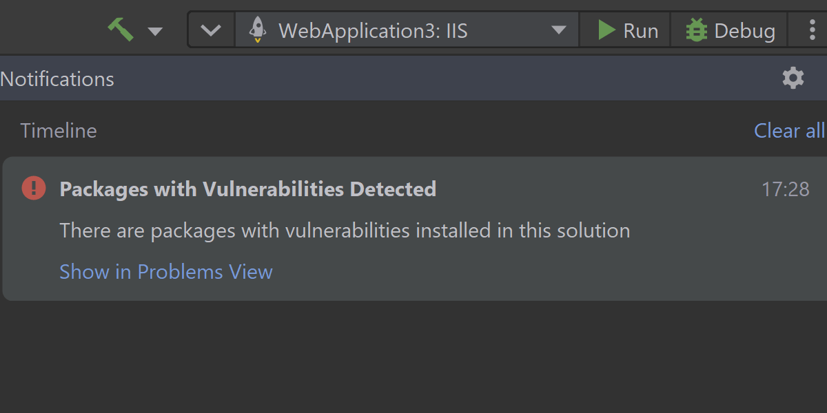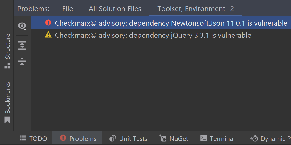 在解决方案中使用开源 NuGet 软件包时,项目都有暴露于安全漏洞的风险。 为了降低这种风险,我们在 Rider 中引入了漏洞依赖项检测。 IDE 将通过通知弹出窗口提醒您注意与 NuGet 软件包使用相关的漏洞依赖项,您可以在 Problems(问题)视图的 Security(安全性)部分进一步调查这些依赖项。 选择特定软件包,还可以在 NuGet Package Management(NuGet 软件包管理)窗口中找到与解决方案中所含软件包相关联的漏洞依赖项的信息。