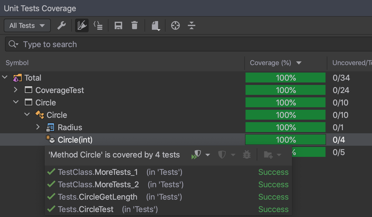 我们已将 Show Covering Tests(显示覆盖测试)操作添加到代码编辑器和 Unit Test Coverage(单元测试覆盖)窗口中的 dotCover 上下文菜单。 此操作会显示一个弹出窗口,其中所有覆盖测试都在同一位置。 弹出窗口还允许您创建新的覆盖会话。