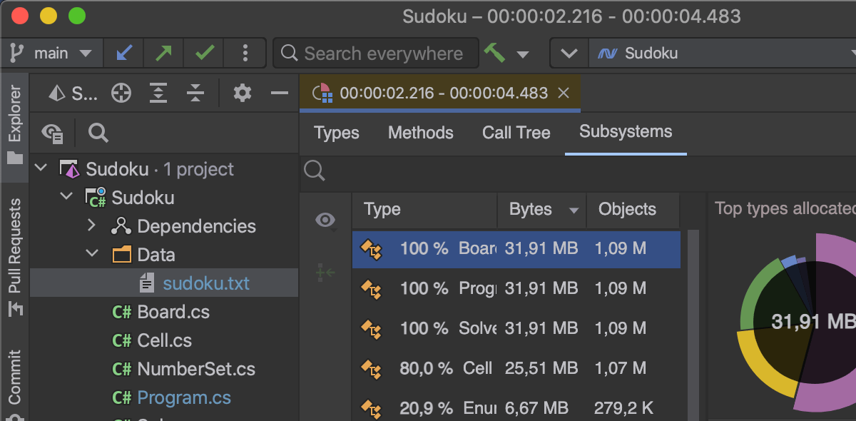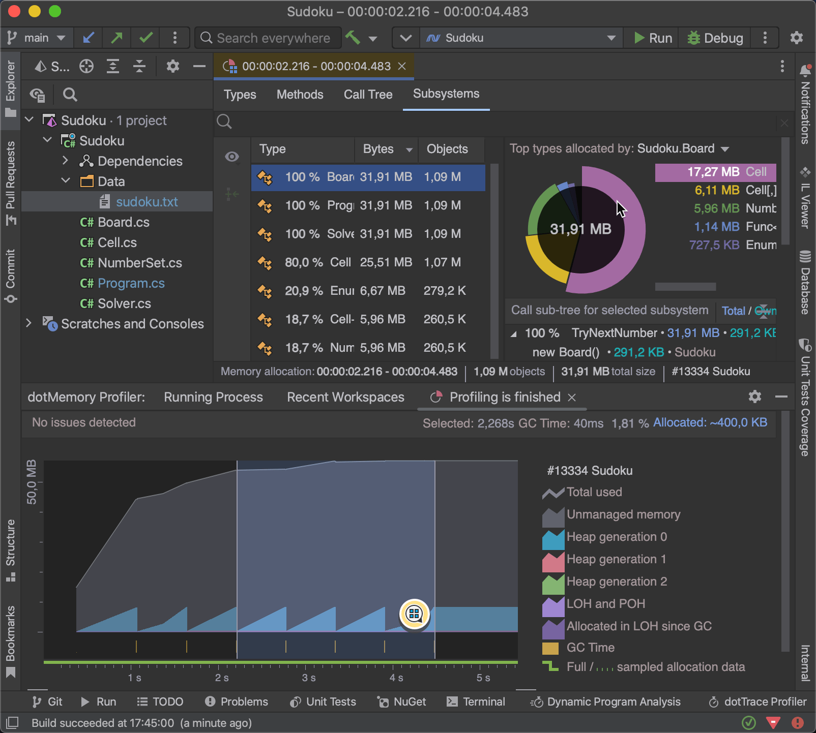 您可以从 Run(运行)菜单将分析器附加到正在运行的进程,实时查看 Timeline Graph(时间线图)展开。 选择时间间隔以打开 Memory Allocations(内存分配)视图,这与 dotMemory Standalone 中相同。 它可以分析特定时间范围内的分配对象和分配调用树。