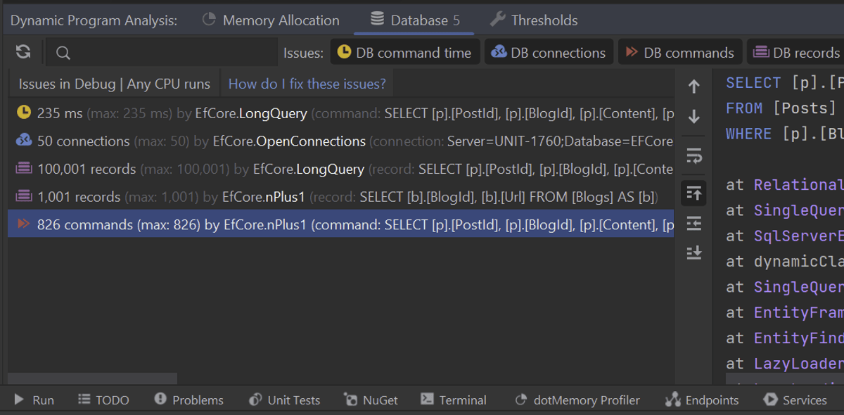 Dynamic Program Analysis (DPA) 添加了新检查,可让您发现与数据库使用相关的各种问题,例如: