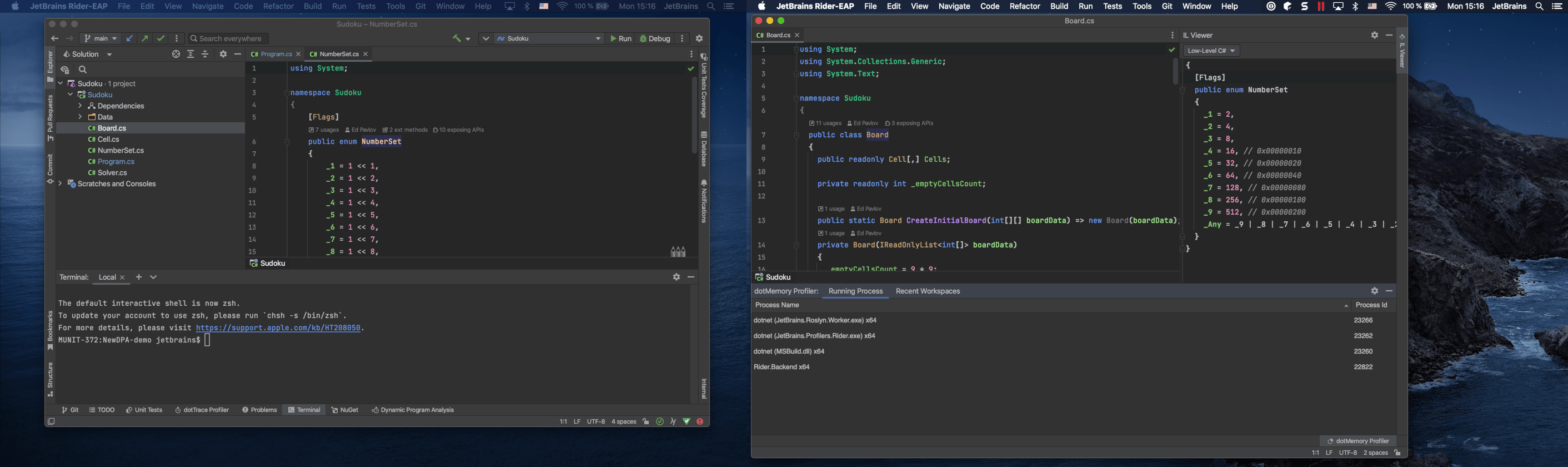 除 Windows 外,dotMemory 现在也可用于 Linux 和 macOS 上的 JetBrains Rider。 Run(运行)微件和 Run | Switch profiler configuration(运行 | 切换分析器配置)菜单提供了两种新的分析模式:Memory (sampled allocations)(内存(采样分配))和 Memory (full allocations)(内存(完全分配))。 您可以在 dotMemory 的帮助中详细了解它们之间的差异。