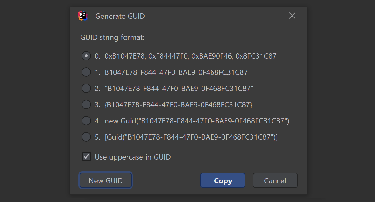 Generate GUID(生成 GUID)工具现在支持 Unreal Engine GUID 格式。 当您需要快速生成 GUID 时,只需从菜单中选择 Tools | Generate GUID...(工具 | 生成 GUID…),首选的十六进制格式将被预先选择。