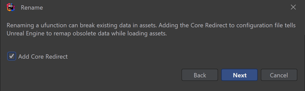 Rider 提供了在通过 Rename(重命名)重构重命名 Unreal 类或属性时添加 CoreRedirects 的选项。 现在也适用于: